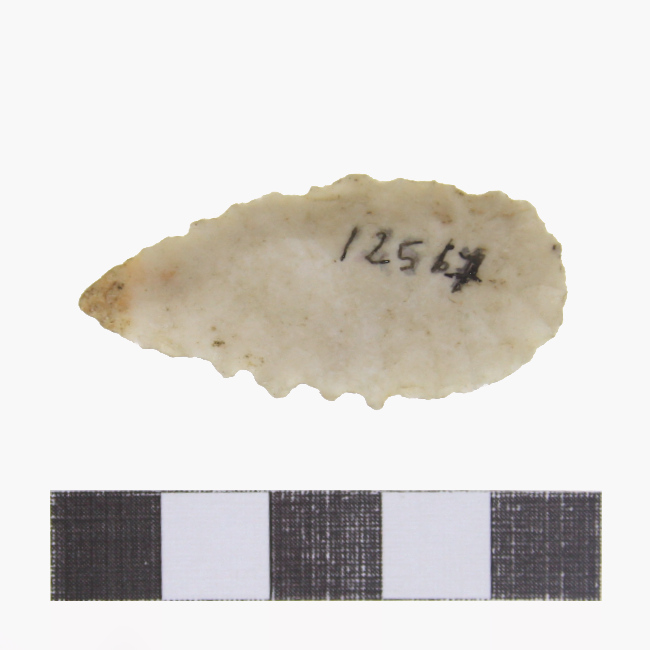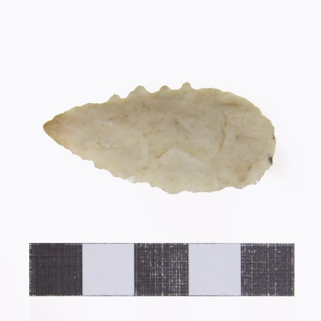 Objeto de uso doméstico de talla bifacial de forma lanceolada, base redondeada y sección biconvexa. Elaborado en materia prima blanquecina, presenta bordes aserrados.