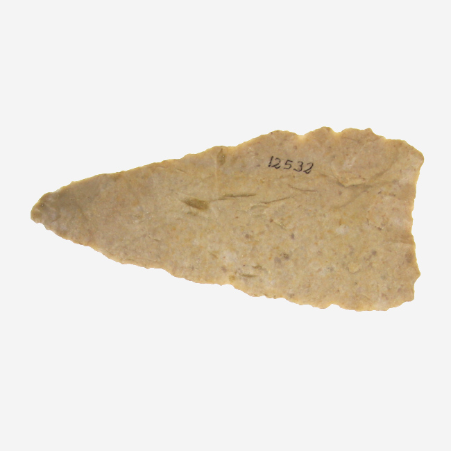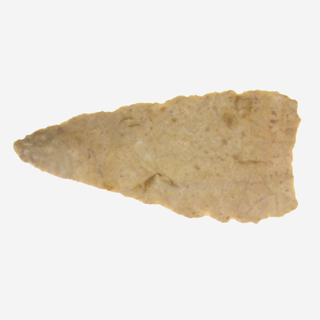 Objeto de uso doméstico de talla bifacial de forma triangular y sección biconvexa. Se encuentra elaborado sobre una matriz de color beige. Presenta un borde activo de forma convexa. Similar en tamaño a hojas líticas taltaloides.