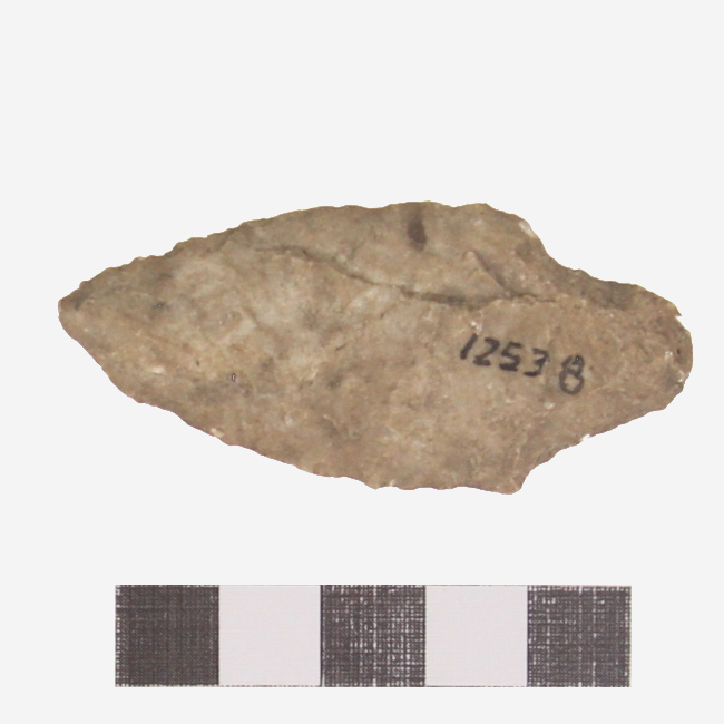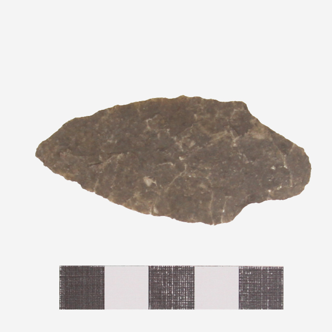 Objeto de uso doméstico de talla bifacial, de forma triangular pedunculada, de base pedúnculo convergente y sección biconvexa. Elaborado en materia prima color beige.