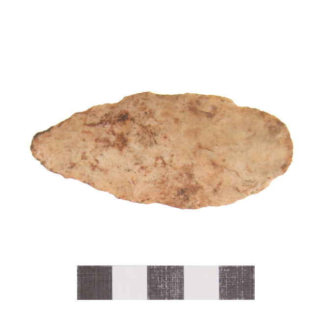 Objeto de uso doméstico y/o ritual, corresponde a un cuchillo u hoja lítica tallado finamente por ambas caras y presenta forma en mandorla de base roma y sección biconvexa. Elaborado en materia prima de color anaranjado. La pieza recibe el nombre alternativo de Hoja Taltaloide.