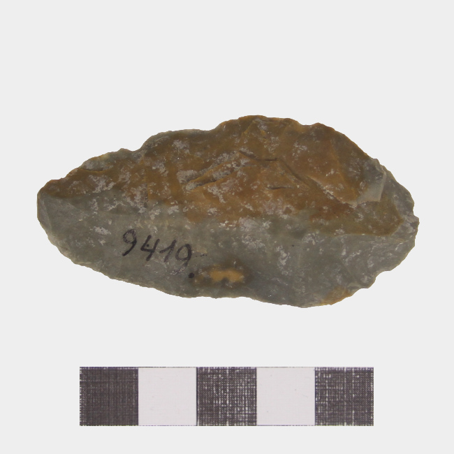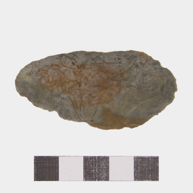 Preforma de instrumento lítico de talla bifacial de forma lanceolada y sección biconvexa, elaborado en materia prima de sílex de color verde con vetas anaranjadas.