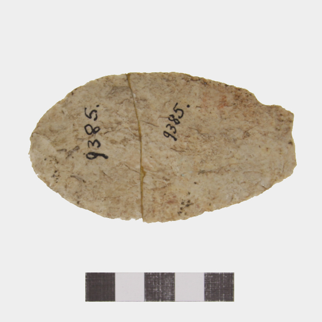 Objeto de uso ritual y/o doméstico de función desconocida. Se encuentra finamente tallado por ambas caras y presenta forma en mandorla de base roma y sección biplana. Elaborado en sílice color blanco. La pieza recibe el nombre alternativo de Hoja Taltaloide.