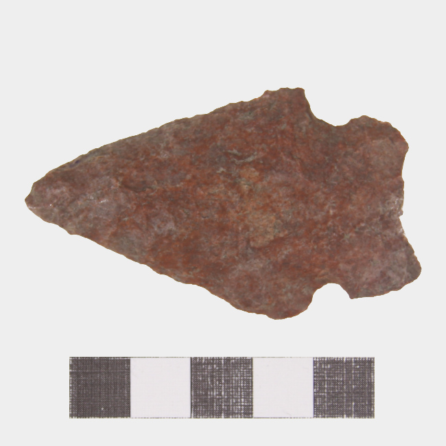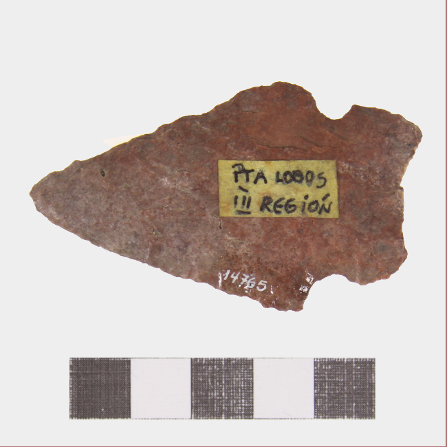 Objeto de uso doméstico de talla bifacial de forma triangular pedunculada, de base pedúnculo divergente y sección biconvexa. Elaborado en materia prima de color rojizo.