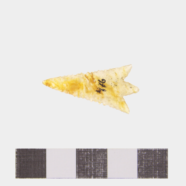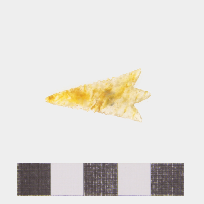 Objeto de uso doméstico de talla bifacial de forma triangular pedunculada con aletas, de base pedúnculo convergente y sección biconvexa. Elaborado en materia prima silícea traslúcida con vetas anaranjadas.