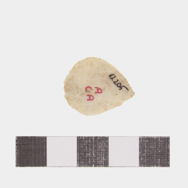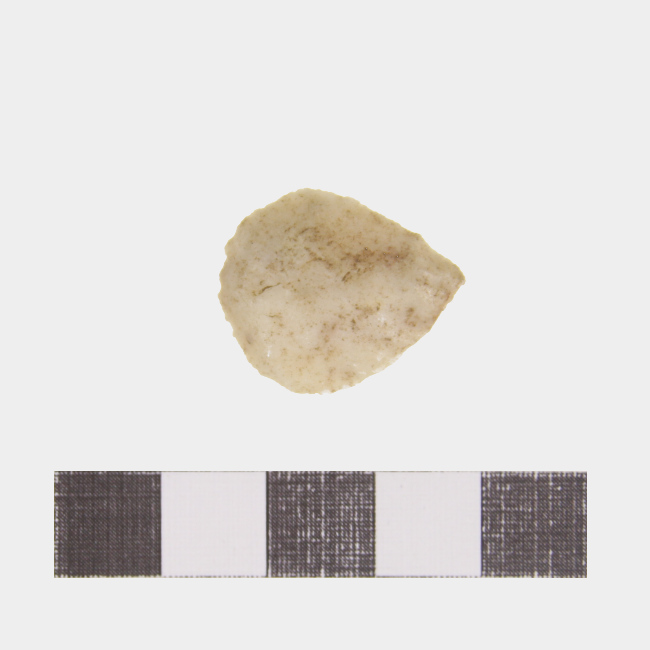 Objeto de uso doméstico de talla bifacial de forma subelipsoidal con extremo apuntado, borde activo convexo y sección plano convexa. Elaborado en materia prima de color blanquecino.