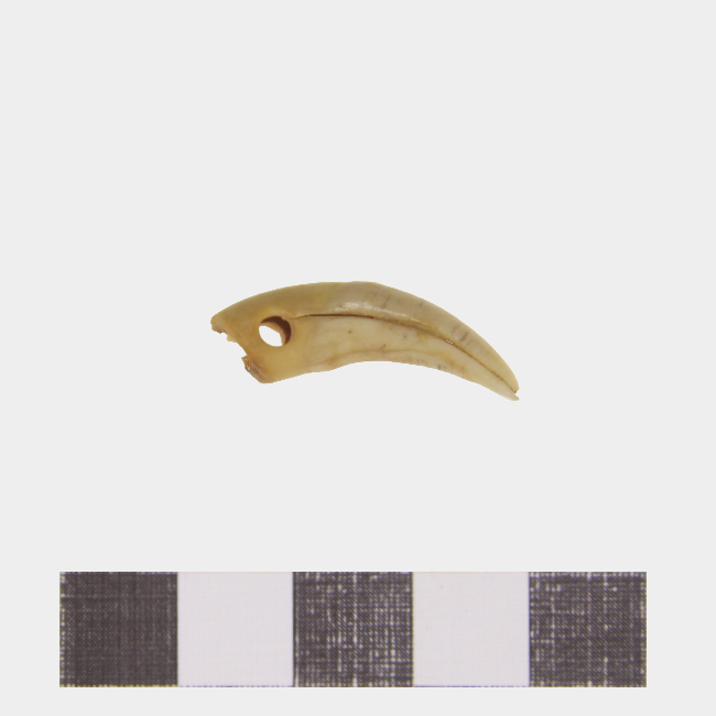 Objeto ornamental de uso personal, elaborado sobre un diente (probablemente canino) de mamífero. Presenta una perforación circular de app. 2 mm de diámetro en su sector proximal para poder pender. Está fracturado a su largo.