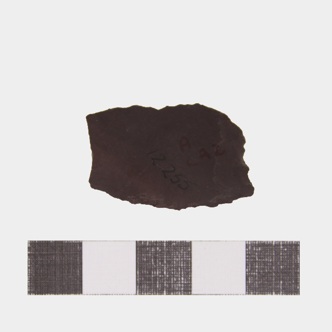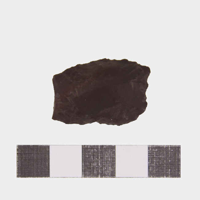 Objeto de uso doméstico de talla monofacial de forma irregular, borde activo convexo y sección plano convexa. Elaborado en materia prima color marrón/morado oscuro.