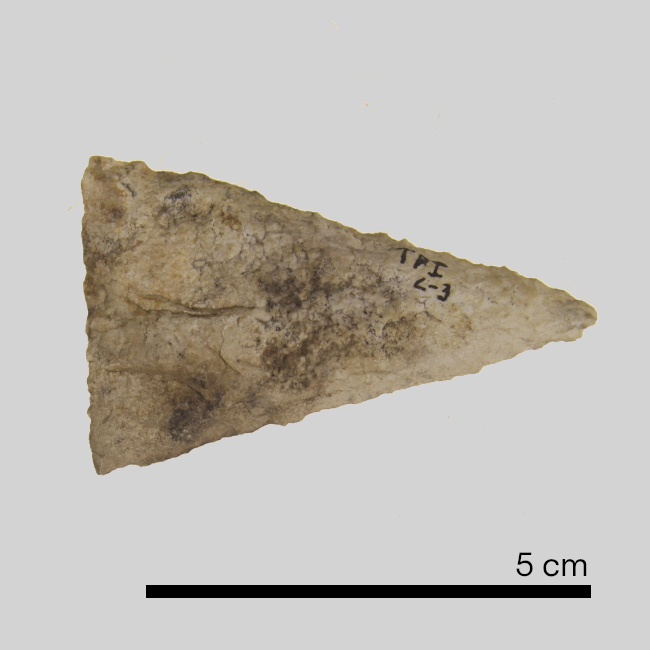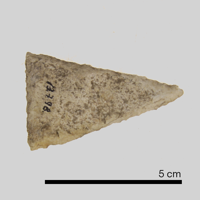 Objeto de uso doméstico de talla bifacial de forma triangular apedunculada, de base recta y sección biconvexa. Elaborado en materia prima color blanquecino.