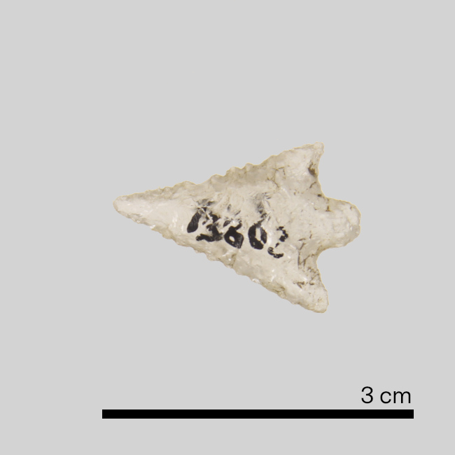 Objeto de uso doméstico de talla bifacial de forma triangular pedunculada con aletas, de base pedúculo convergente y sección biconvexa. Elaborado en materia prima silícea traslúcida.