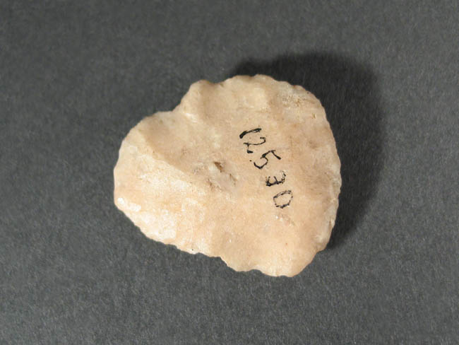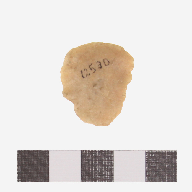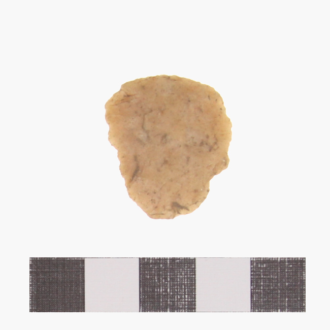 Objeto de uso doméstico de talla bifacial de forma irregular y sección plano convexa. Se encuentra elaborado sobre una matriz de color beige. Presenta un borde activo de forma convexa.