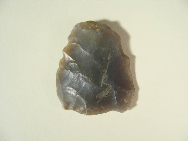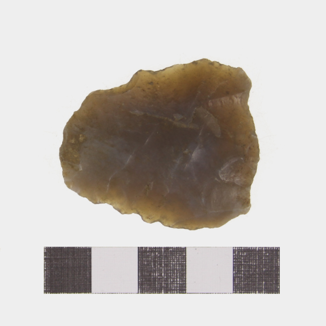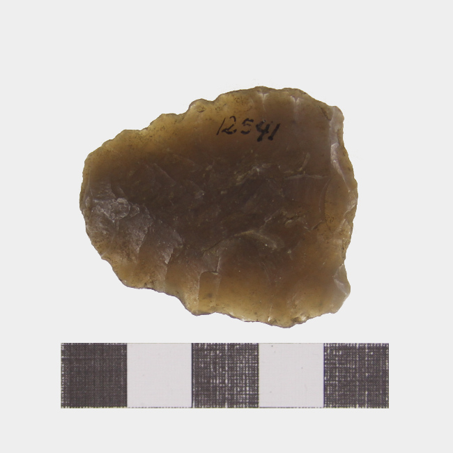 Objeto de uso doméstico de talla bifacial de forma subtriangular, apedunculada y bordes activos semi-convexos. Elaborado en calcedonia traslúcida de color gris.