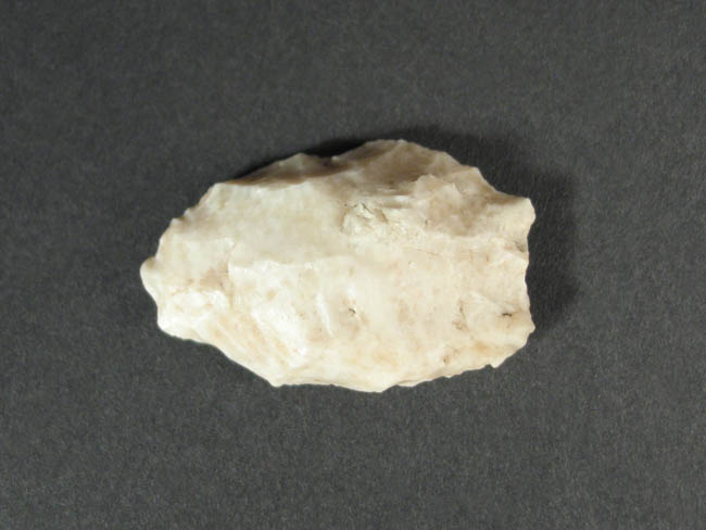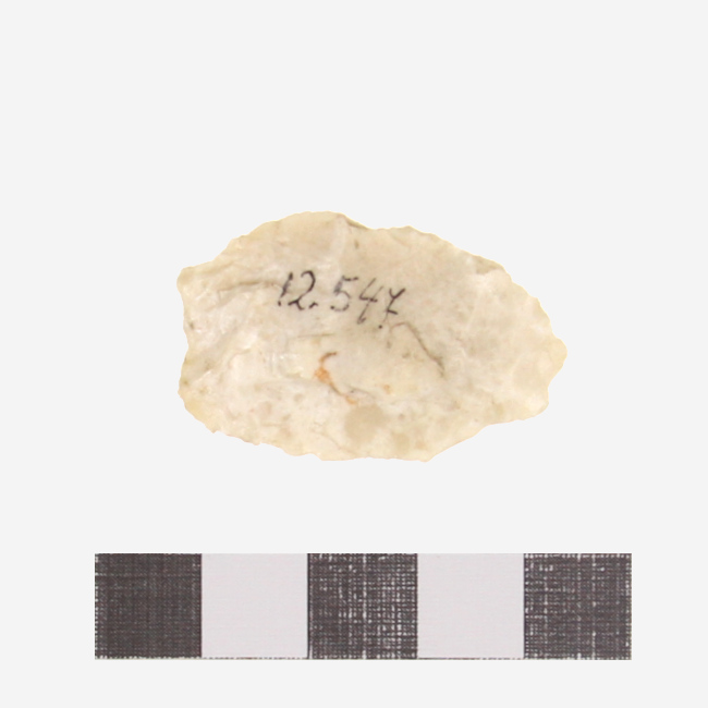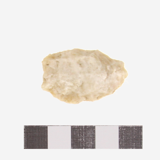 Objeto de uso doméstico de talla bifacial de forma subelipsoidal y sección plano convexa. Se encuentra elaborado sobre una matriz de color beige. Presenta un borde activo de forma convexa.