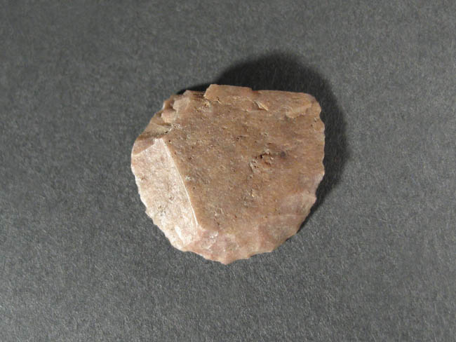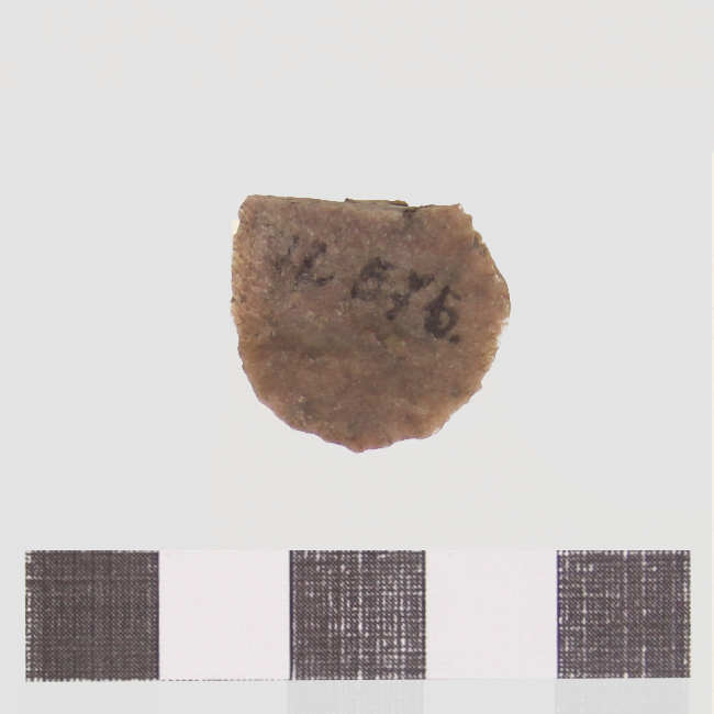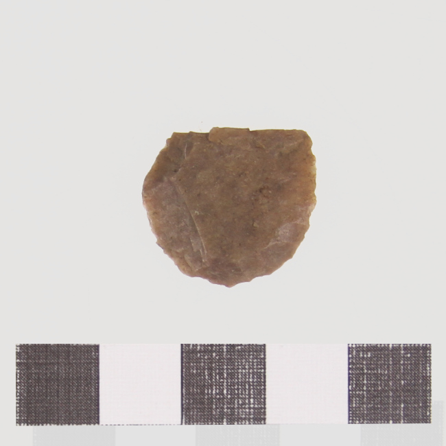 Objeto de uso doméstico de talla bifacial de forma irregular y sección plano convexa. Se encuentra elaborado sobre una matriz de color marrón. Presenta un borde activo de forma convexa.