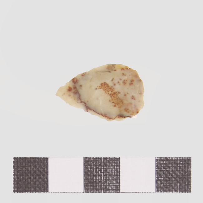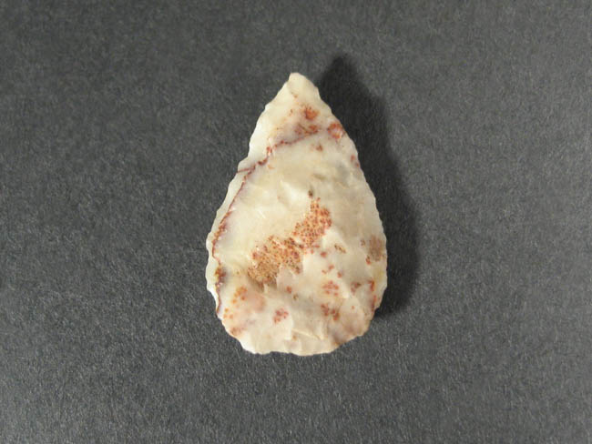 Objeto de uso doméstico de talla bifacial de forma apuntada y sección biconvexa. Se encuentra elaborado sobre una matriz de color blanquecino. Presenta un borde activo de forma convexa.