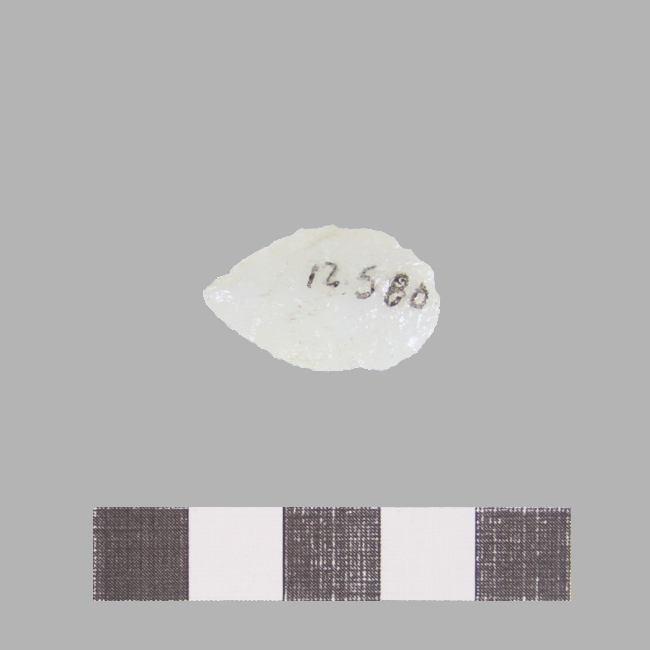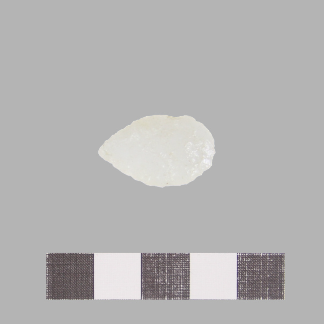 Objeto de uso doméstico de talla bifacial de forma apuntada y sección biconvexa. Se encuentra elaborado sobre una matriz de color blanquecino. Presenta un borde activo de forma convexa.