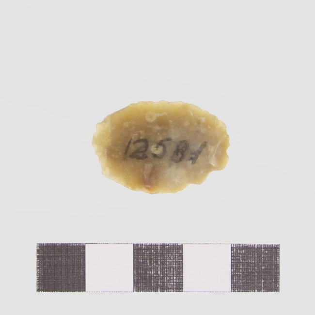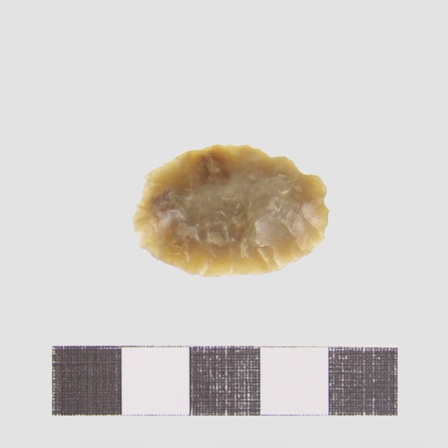 Objeto de uso doméstico de talla bifacial de forma elipsoidal y sección plano convexa. Se encuentra elaborado sobre una matriz silícea de color marrón claro. Presenta un borde activo de forma convexa.
