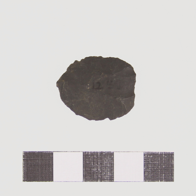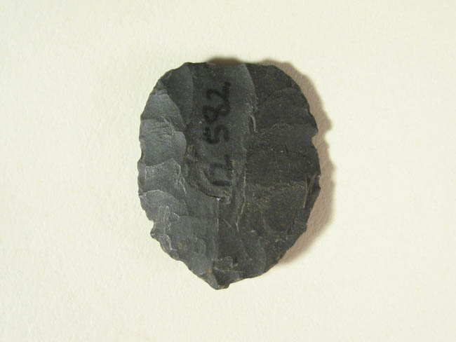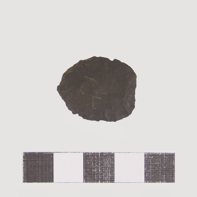 Objeto de uso doméstico de talla bifacial de forma subelipsoidal y sección plano convexa. Se encuentra elaborado sobre una matriz silícea de color negro. Presenta un borde activo de forma convexa.