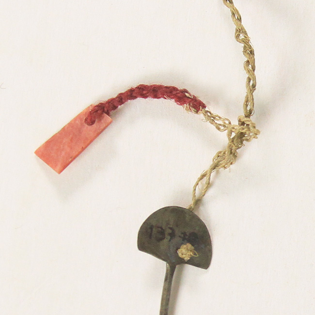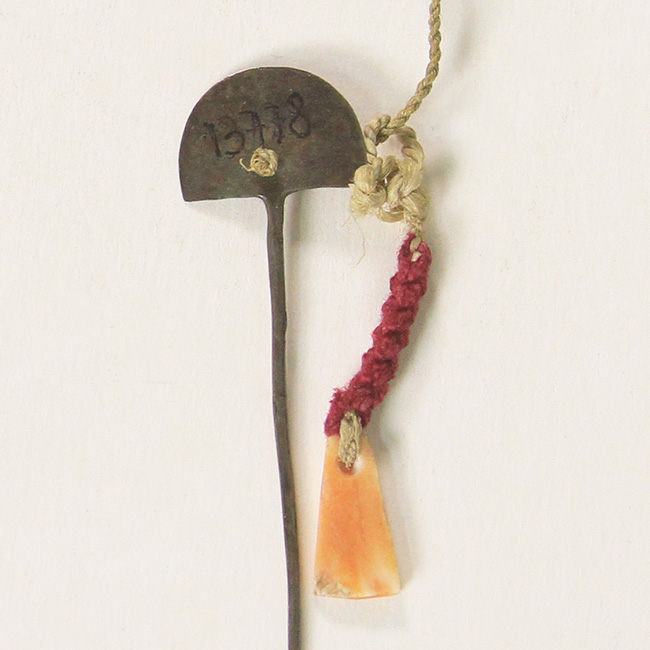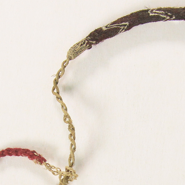 Lazo tejido en lana y decorado en ambos extremos. Termina en fibra vegetal trenzada, con un tupu de plata en cada uno de sus extremos. Del centro del lazo cuelgan dos hilos mixtos de fibra vegetal y lana trenzada, con un adorno de concha de Spondylus cada uno.