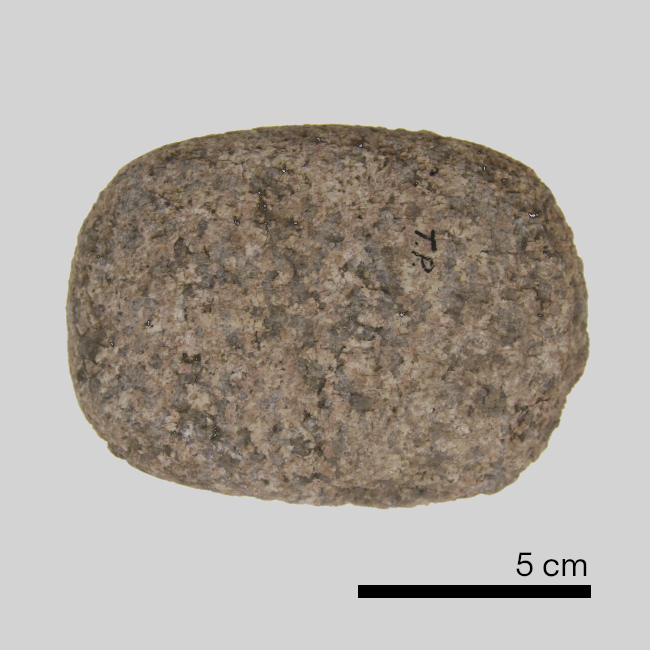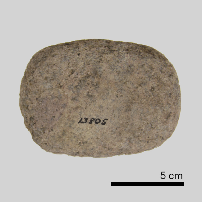 Objeto de uso doméstico de forma elipsoidal, con dos caras levemente convexas formatizadas a partir de pulido. Presenta además piqueteo en los bordes. Uso para la molienda.