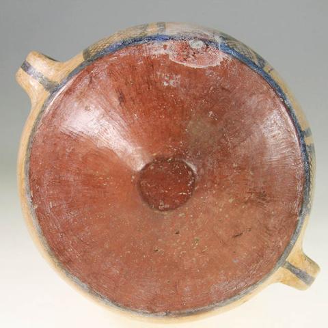 Contenedor de uso doméstico y/o ritual, de forma simétrica, restringido con cuello y de perfil complejo. Presenta cuerpo ovoide invertido, cuello hiperboloide, base ápoda o apuntada, borde hiper-evertido y labio redondeado. Tiene un par de asas correa dispuestas verticalmente y emplazadas en el tercio inferior del cuerpo, así como un par de asas en suspensión y un modelado zoomorfo en el tercio superior del cuerpo. El tratamiento de superficie es pulido y pintado en negro y rojo sobre blanco engobado por exterior hasta el punto de quiebre desde donde es rojo engobado. Se encuentra decorado en un diseño complejo dispuesto entre el cuello y el punto de quiebre, en el cuello se presenta una serie simple de líneas horizontales y en el cuerpo tres campos de bandas verticales, una central de rombos en hilera con reticulado oblicuo y dos laterales con reticulado oblicuo (estilo cuzqueño). También es posible apreciar huellas de uso relativas a una erosión leve en toda la pieza.