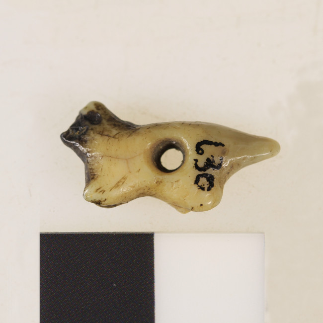 Objeto elaborado en hueso que representa a un animal (posible mamífero), tallado y pulido. El animal tiene una cabeza con ojos y boca incisos, cuatro patas (una fracturada) y una cola. Presenta perforación central para sujeción como posible colgante.