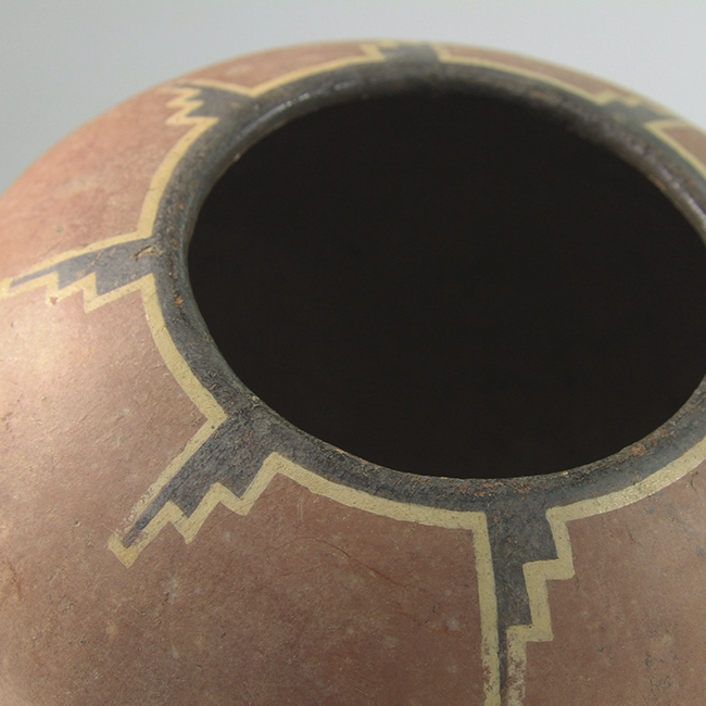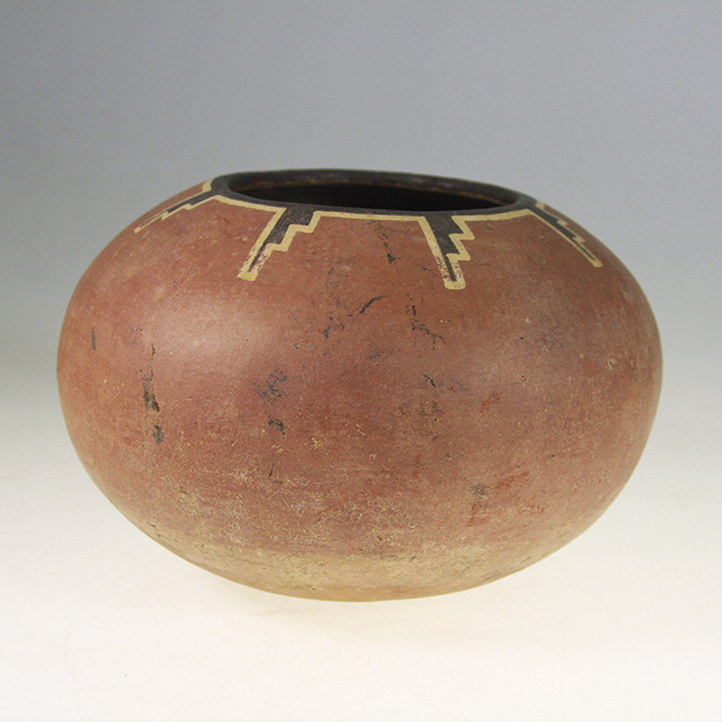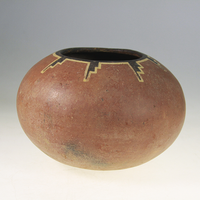 Objeto de uso doméstico de forma globular restringida, textura suave, decoración externa adosada al borde en colores negro y blanco, cuerpo en color rojo.