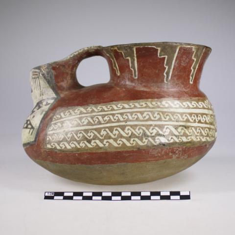 Vasija restringida de perfil complejo, cuerpo subglobular, base convexa, cuello evertido y labio redondeado. Su apertura en un extremo conecta con un modelado antropomorfo en el otro mediante un asa puente convexa en forma de arco.