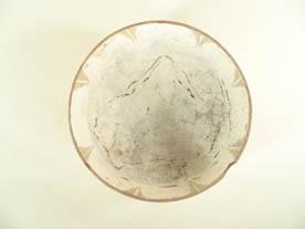 Tratamiento superficial engobado, interior blanco con pinturas negras de triángulos escalerados invertidos en el borde y figura antropomorfa en el fondo, y diseños decorativos externos de doble ZigZag y escalerados, rojo y negro sobre blanco; base engobada roja.
