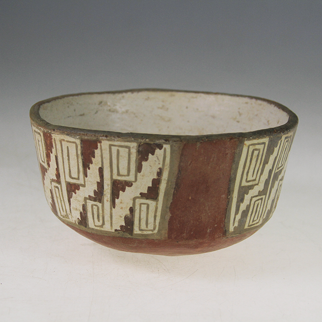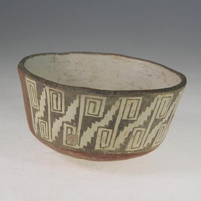 Objeto de uso doméstico y/o ritual de forma simétrica no restringida de perfil simple, paredes rectas evertidas, base convexa y labio redondeado. Superficie alisada, engobe rojo y decorada externamente con motivos Zigzag, en colores negro y rojo sobre blanco. Uso contenedor y ceremonial funerario.
