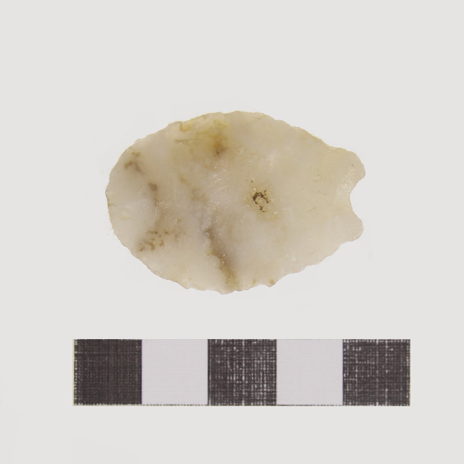 Objeto de uso doméstico de talla bifacial de forma subelipsoidal, borde activo convexo y sección plano convexa. Presenta dos pedúnculos para enmangue. Elaborado en materia prima translucida de color blanco.