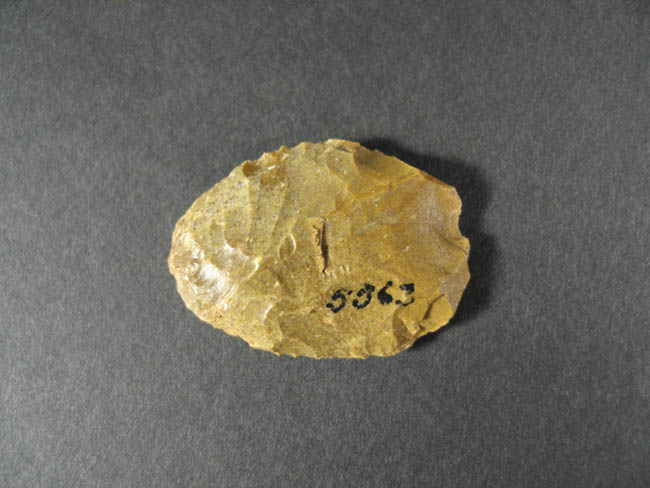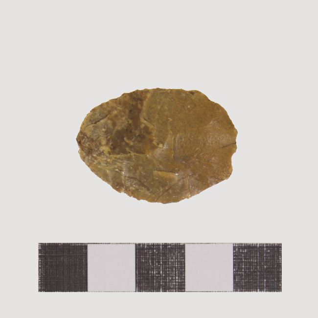 Objeto de uso doméstico de talla bifacial de forma elipsoidal, borde activo convexo y sección plano convexa. Elaborado en materia prima de color anaranjado.