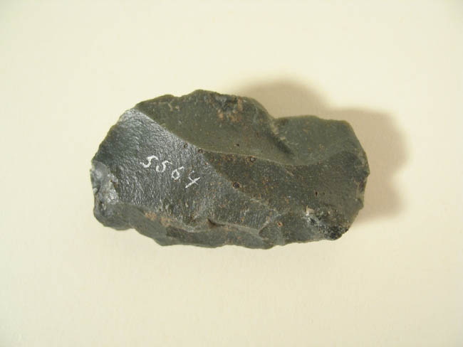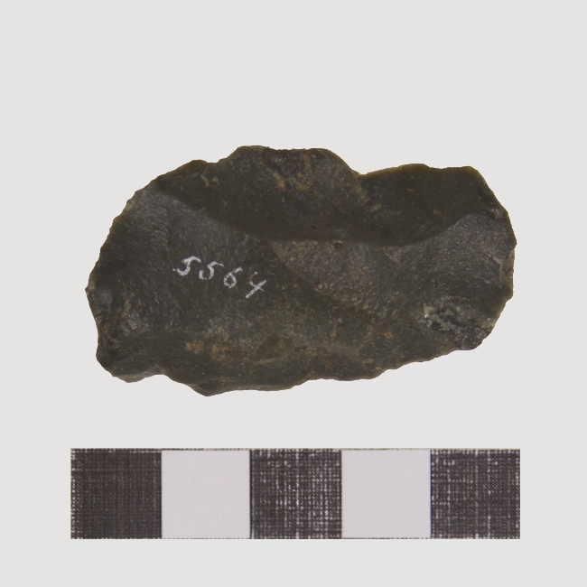Objeto de uso doméstico de talla bifacial de forma elipsoidal, borde activo convexo y sección biconvexa. Elaborado en materia prima de color gris oscuro.