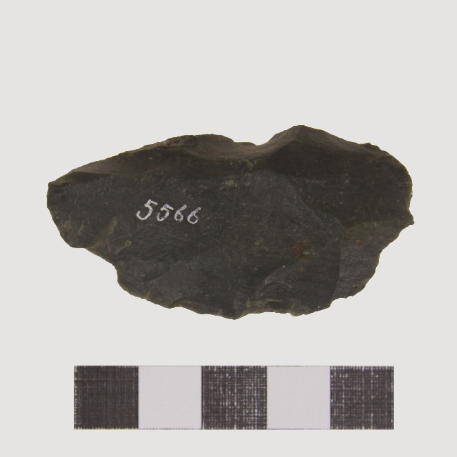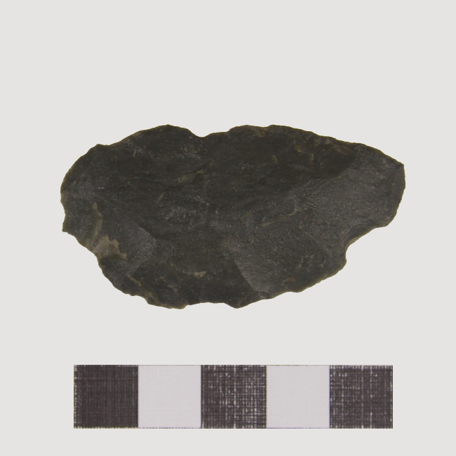 Objeto de uso doméstico de talla bifacial de forma elipsoidal, bordes activos semiconvexos y sección biconvexa. Elaborado en materia prima de color negro.