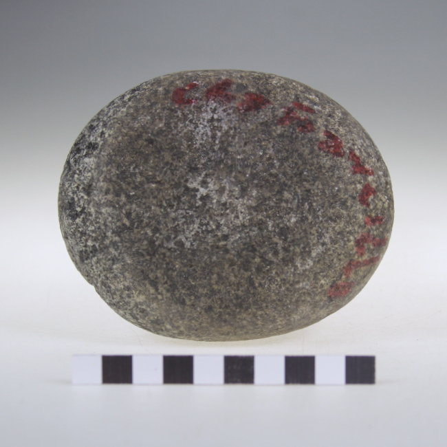 Objeto de uso doméstico formatizado de forma subelipsoidal utilizado para la molienda en fricción con otro objeto lítico. Presenta sus dos superficies mayores utilizadas, además de piqueteo en los bordes.