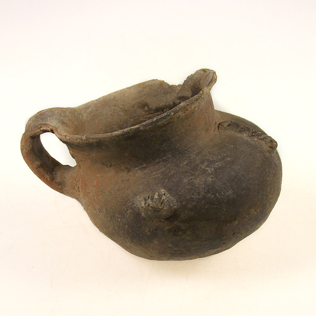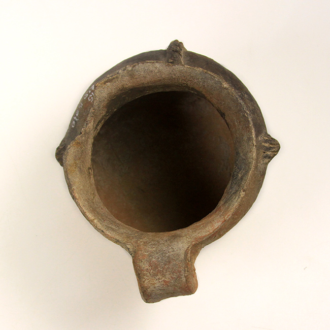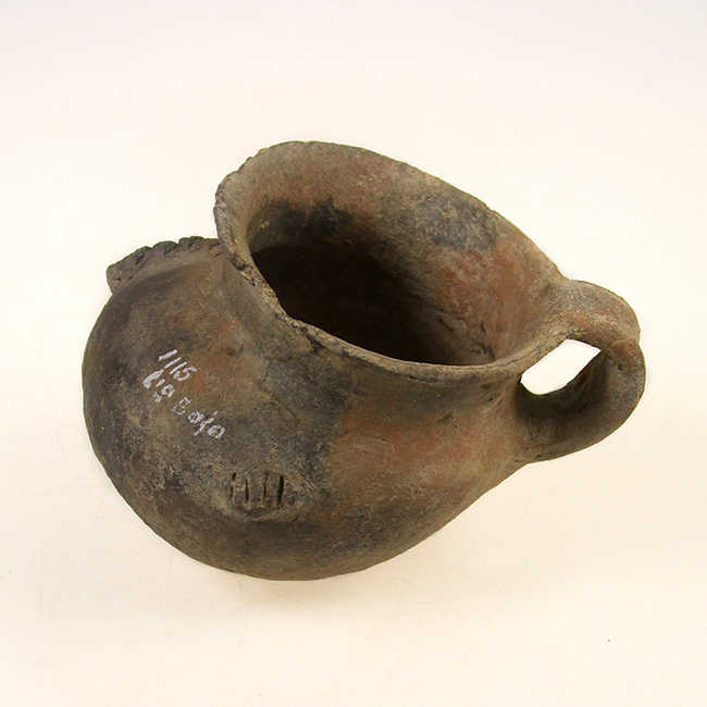 Contenedor de uso doméstico y/o ritual asimétrico, de estructura restringida con cuello y perfil compuesto. Corresponde a una vasija o jarro zapato Diaguita de cuerpo elipsoidal y cuello subcilíndrico/hiperboloide, de base convexa, borde evertido y asa labioadherida vertical. Su superficie es monocroma alisada color marrón con parches de hollín por exposición directa al fuego. Presenta a cada costado un aditamento mamelonar elipsoidal con incisiones verticales, mientras que en su cara frontal tiene un aditamento alargado vertical con incisiones paralelas oblícuas.