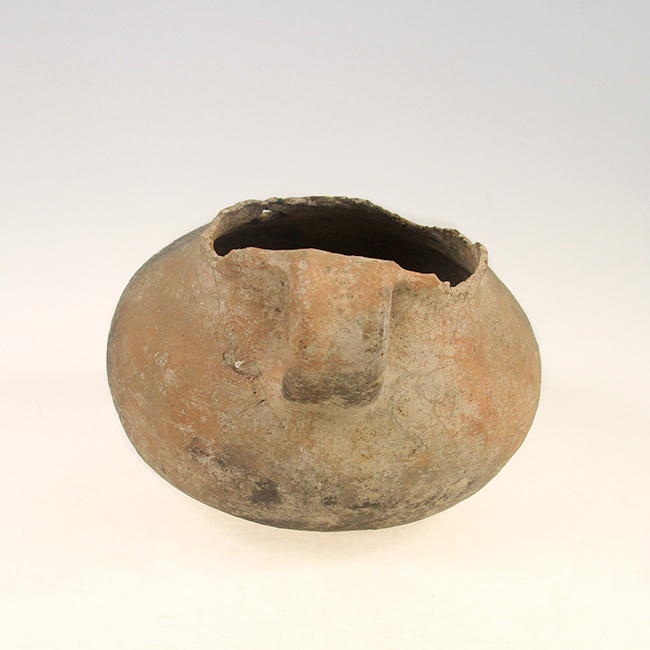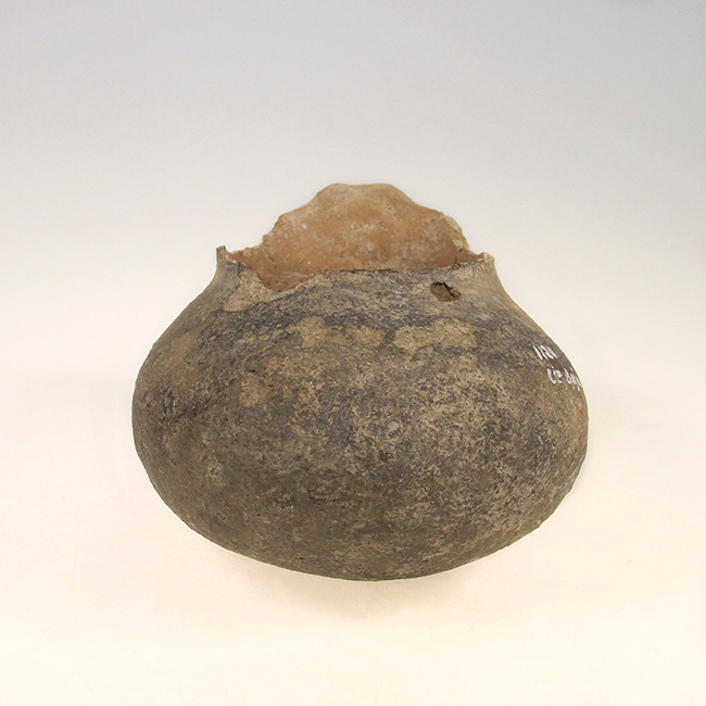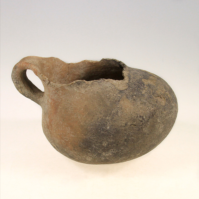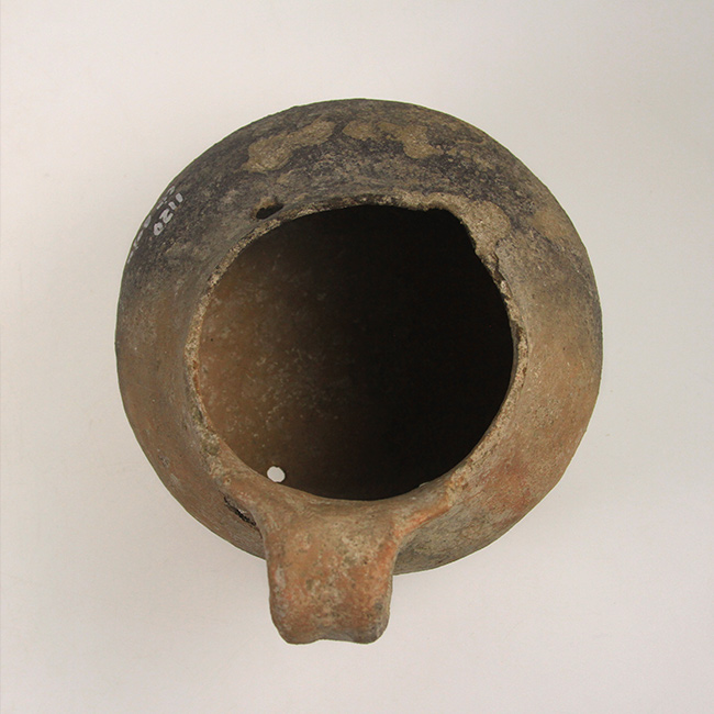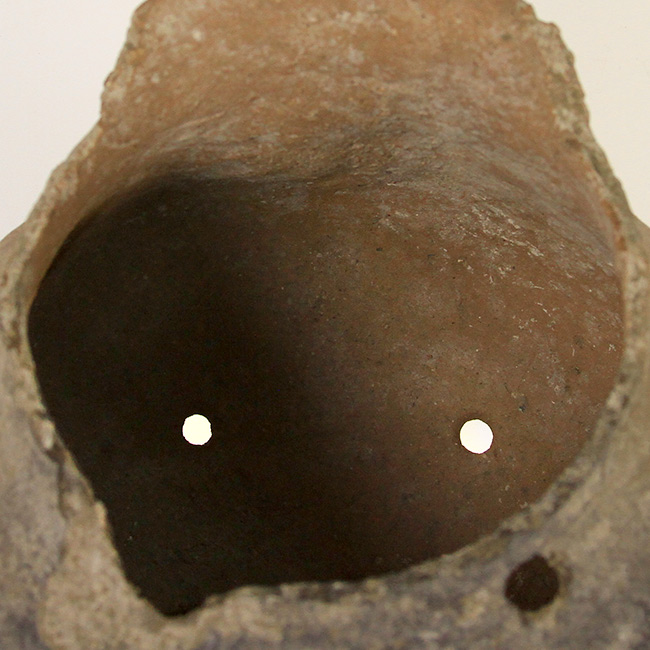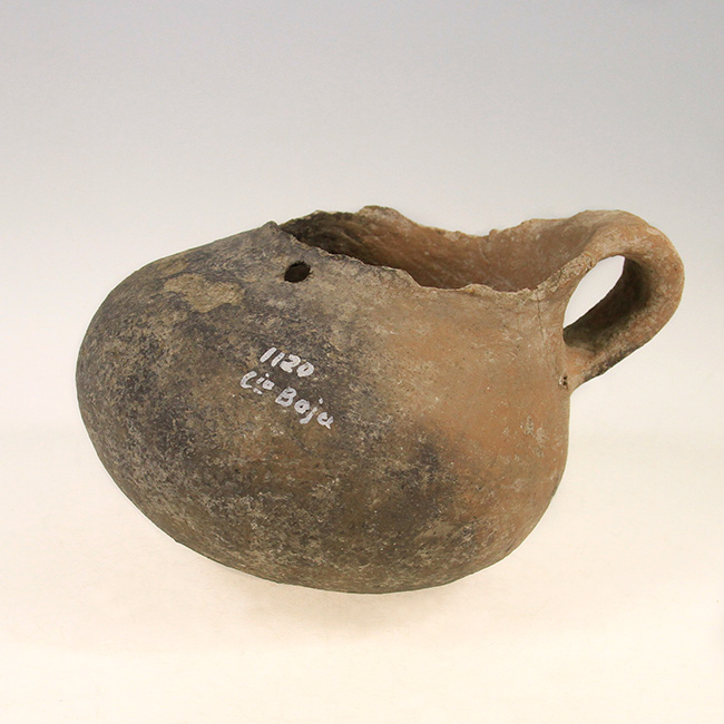 Contenedor de uso doméstico y/o ritual asimétrico, de estructura restringida con cuello y perfil posiblemente inflectado. Corresponde a una vasija o jarro zapato Diaguita de cuerpo elipsoidal, cuelo probablemente hiperboloide, base convexa, borde posiblemente evertido y asa labioadherida vertical. La superficie es monocroma alisada de color marrón con parches de hollín producto de la exposición directa al fuego. Tiene tres agujeros o "matados", uno bajo el punto de inflexión y los otros dos en la base.
