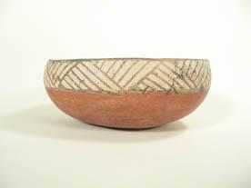 Vasija de forma simétrica, estructura no restringida y perfil simple. Borde invertido, labio redondeado, cuerpo subcircular y base ligeramente convexa (con hendidura al centro). Tratamiento de superficie engobado (rojo exterior/interior). El cuerpo está decorado con una banda horizontal continua de diseño diaguita: triángulos de líneas oblicuas en patrón zigzag (Cornejo 1989); color negro sobre blanco. Corresponde al tipo cerámico "Transición" propuesto por Cornely (1956) y retomado por Cantarutti (2002:21-24). Función primaria: servicio y consumo de alimentos (huellas de uso). Función secundaria: ofrenda.