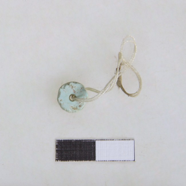 Objeto ornamental de uso personal de forma discoidal, sección plana y una perforación central bicónica. Cuenta de collar elaborada en malaquita de color verdoso.