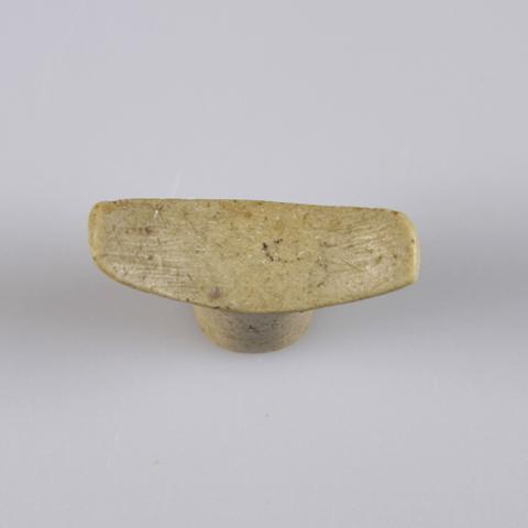 Objeto ornamental de uso personal de forma cilíndrica, elaborado en piedra talcosa de color gris. Presenta dos apéndices laterales para permitir su sujeción al labio inferior de un individuo. El objeto ha sido definido como "tembetá cilíndrico con alas corto".