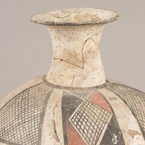 Contenedor de uso doméstico y/o ritual, de forma simétrica, restringido con cuello y de perfil complejo. Presenta cuerpo ovoide invertido, cuello hiperboloide, base ápoda o apuntada, borde hiper-evertido y labio redondeado. Tiene un par de asas cinta dispuestas verticalmente y emplazadas en el tercio inferior del cuerpo. El tratamiento de superficie es pulido y pintado en negro y rojo sobre blanco engobado por exterior. Una sección del cuerpo se encuentra decorada (entre el cuello y el punto de quiebre), donde se disponen bandas verticales: una central con una serie de rombos con reticulado oblicuo inscrito y dos laterales con reticulado oblicuo inscrito. También es posible apreciar huellas de uso relativas a un grado mayor de erosión en la base y descascarados en algunos sectores del cuerpo.
