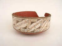 Pared recta, base convexa roja, interior rojo, una banda adosada al borde externo en colores negro, rojo, blanco (lineas paralelas, diagonales, ganchos y escalerados), textura suave.