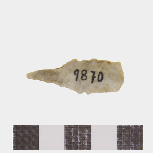 Objeto de uso doméstico de talla bifacial forma alargada y aguzado en un extremo, de sección biconvexa. Podría haber sido usado como instrumento para perforar, grabar y/o raspar.