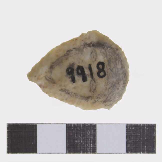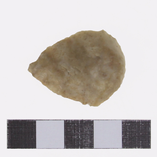 Objeto de uso doméstico de talla bifacial de forma elipsoidal con extremo apuntado y sección plano convexa. Se encuentra elaborado sobre una matriz de color beige. Presenta un borde activo de forma convexa.