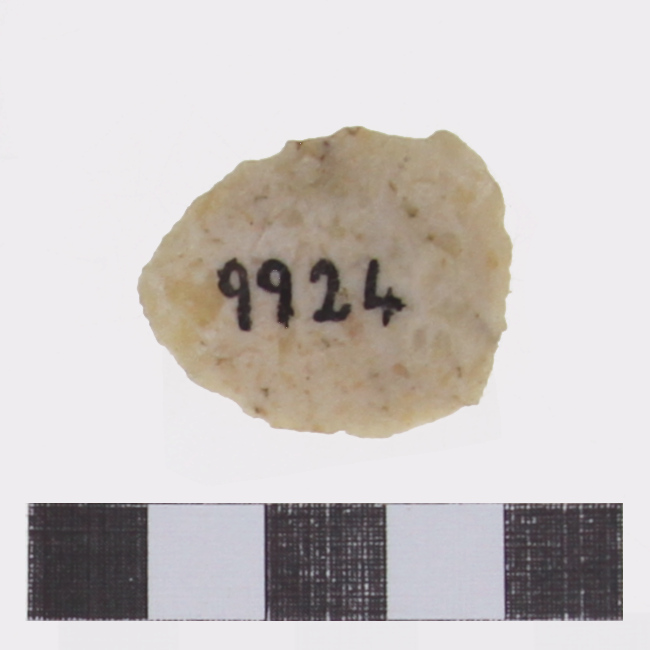 Objeto de uso doméstico de talla bifacial de forma subtriangular y sección biconvexa. Se encuentra elaborado sobre una matriz de color beige. Presenta un borde activo de forma convexa.