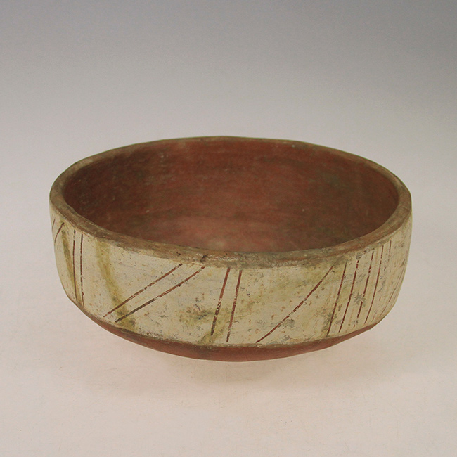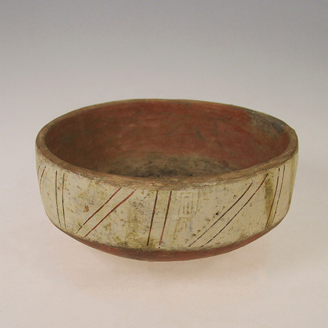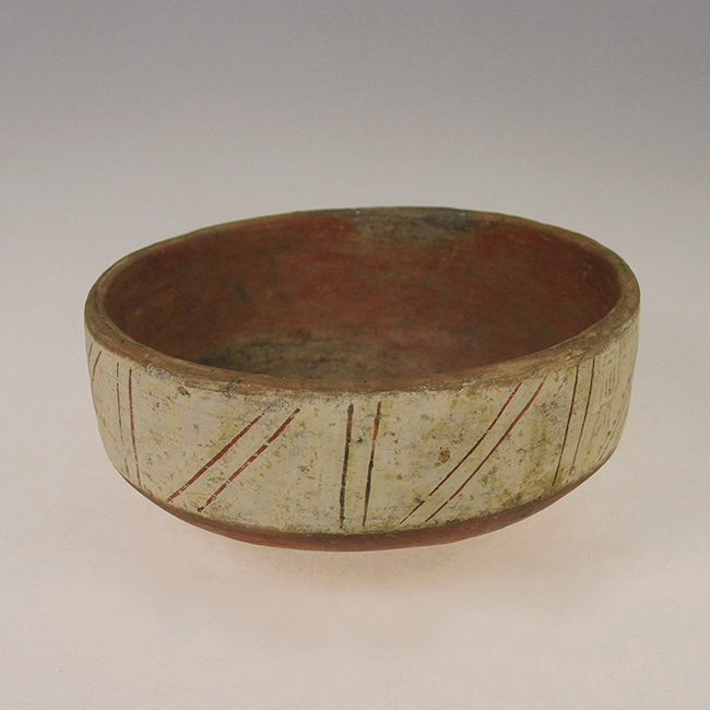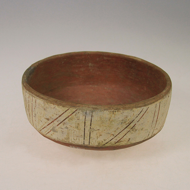 Contenedor de uso doméstico y/o ritual simétrico, de estructura no restringida y perfil simple. Corresponde a una vasija o plato Diaguita de cuepro cilíndrico, borde directo y base convexa, engobado en el interior de color blanco y la base del exterior de color rojo. Tiene una banda decorativa en el exterior donde se exhibe una variante del patrón Zigzag (González, 2013) en negro y rojo sobre blanco. Negro deslavado.