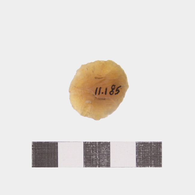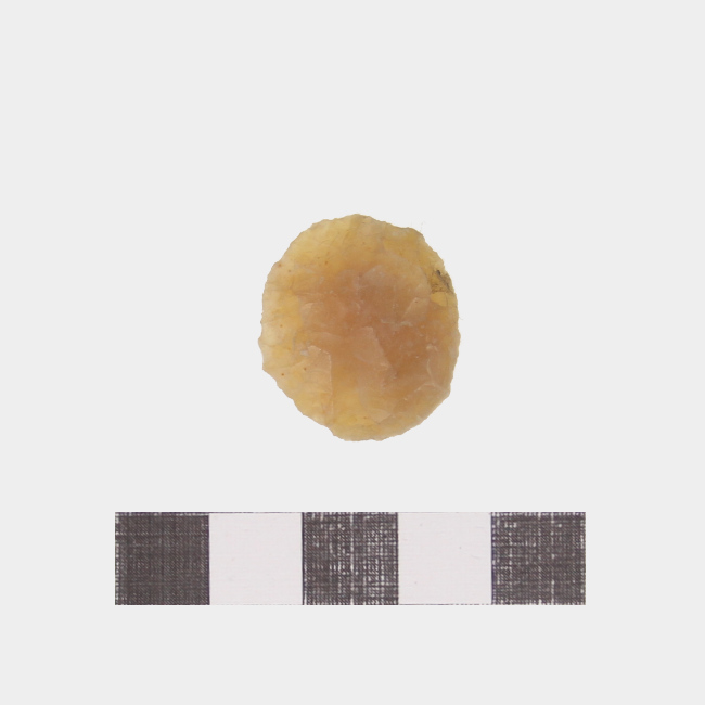 Objeto de uso doméstico de talla bifacial de forma subcircular, borde activo convexo y sección plano convexa. Elaborado en materia prima silícea de color amarillento.