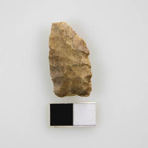 Pieza de forma lanceolada con bordes paralelos y base recta. Color café. Se encuentra fragmentada en su extremo distal.