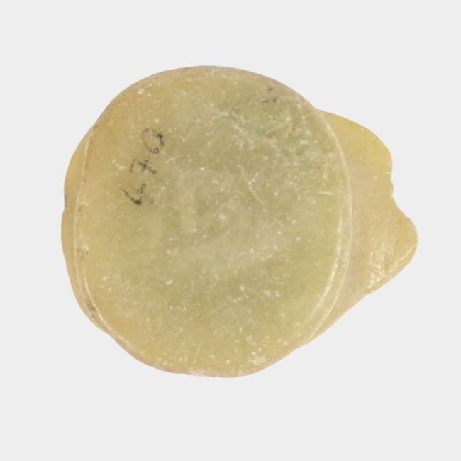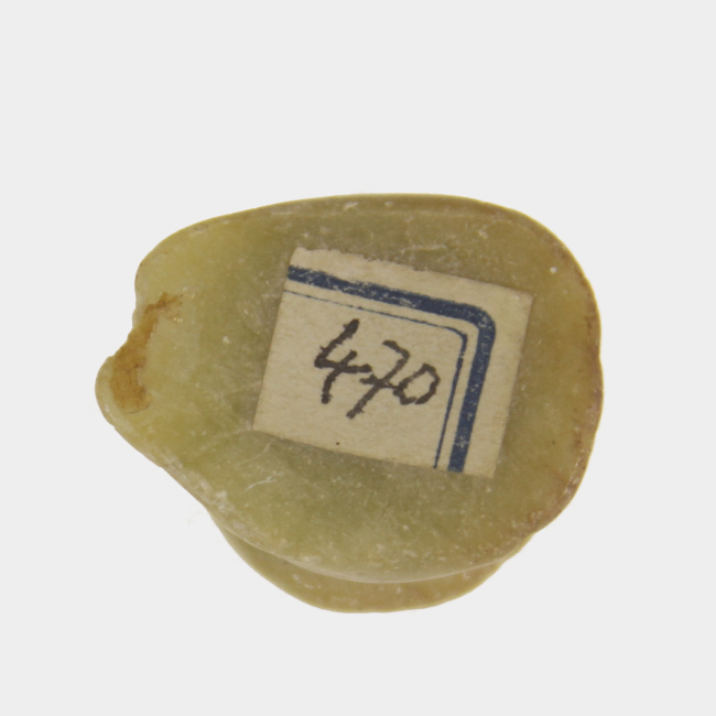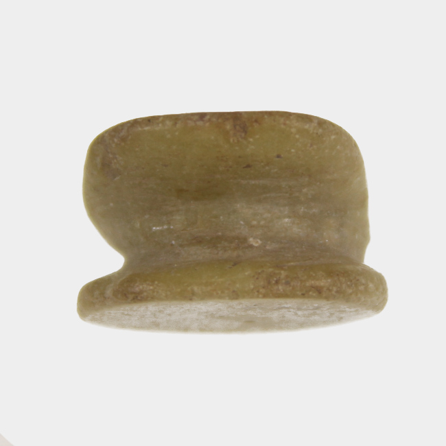 Objeto ornamental de uso personal, de cuerpo hiperboloide y sección elipsoidal. Elaborado en materia prima de color blanquecino. Presenta dos apéndices laterales de forma convexa para permitir su sujeción al labio inferior, ambos están pracialmente fracturados. En la literatura del área, este tipo de adorno ha sido definido como Tembetá de Botón o Discoidal con alas.