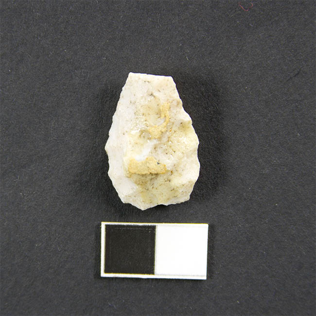 Pieza de forma triangular con base recta. Materia prima de color blanco. Confeccionada con retoques marginales y descontinuos sobre la superficie de la pieza.
