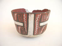 Interior en color rojo y blanco, cilindrico, base circular hundida, fondo-base color blanco, exterior dos campos decorativos adosados al borde-cuerpo (escalerados, ganchos, lineas serpentiforme mas dos campos rectangulares en blanco y negro juntos a lso demas motivos.